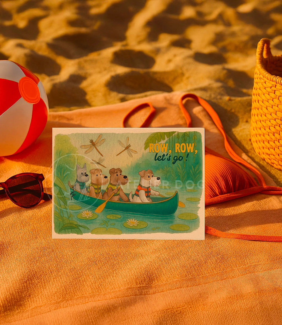 Fox, welsh/airedale, lakeland terrier & schnauzer dogs canoeing greeting card